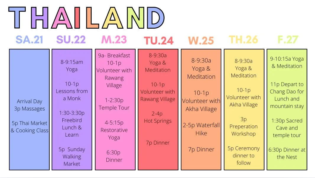 Rebeccah Bartlett lived in Chingmai for nearly a decade. She has been running volunteer trips for 15 years and taken over 100 volunteers abroad. She is also a trauma-informed 500 hour experienced yoga teacher, aryuveda certified, reiki master and has a deep love of this culture, creating community connection and lives for helping to guide you on these unique retreat experiences!